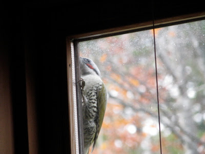 ドアをノックするような音がして、誰も来てないので、キツツキだと分かりました。アオゲラです。赤い帽子をかぶっています。窓枠の隙間に入り込んでいるカメムシを食べているようです。その勢いで、どんどん取って食べてちょうだい!