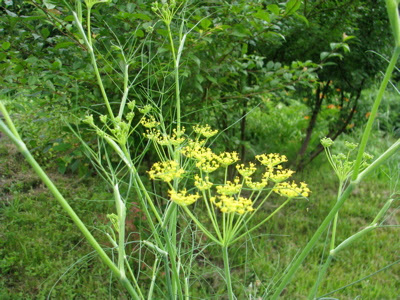 ハーブのオレガノの花です。その次は深紅のワイルドベルガモット。ハーブのフェンネルが黄色い小さな花を付けました。これからまだまだ蕾がたくさんあるので、古タイヤの中でどこまでも伸びる勢いです。